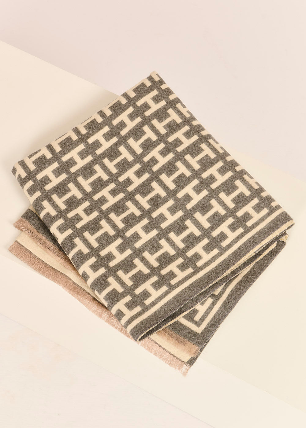 Mit diesem eleganten Schal setzen Sie ein Statement, denn das markante, grafische H-Muster in stilvollen Grau- und Beigetönen sorgt für einen edlen Wiedererkennungswert. Gehüllt in dieses Tuch genießen Sie eine luxuriöse Wärme und ein angenehm weiches Tragegefühl, das Sie stilvoll durch die kühle Jahreszeit begleitet. Mit seinem zeitlosen Design und den feinen Fransen ist dieser Schal ein perfekter Akzent, der jedem Outfit eine subtile, aber selbstbewusste Note verleiht.