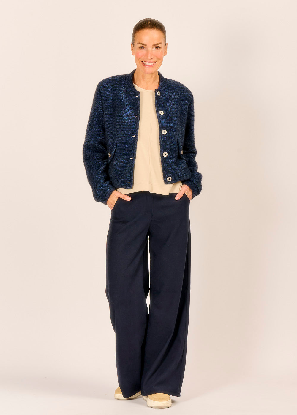 Dieses kurze Bomberino in tiefem Blu Scuro (Dunkelblau) ist ein sehr stylisches und modernes Statement-Piece, das eine lässige Silhouette mit eleganter Textur vereint. Besonders edel wirken die kontrastierenden, großen, perlmuttartigen Knöpfe, welche der Jacke einen einzigartigen, hochwertigen Akzent verleihen. Tragen Sie diese charmante Strickjacke als schicken Ersatz für einen Blazer, um Ihrem Outfit sofort einen frischen und modischen Twist zu geben.