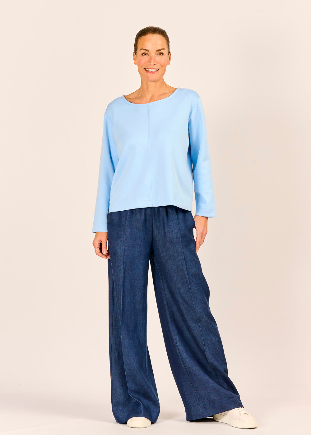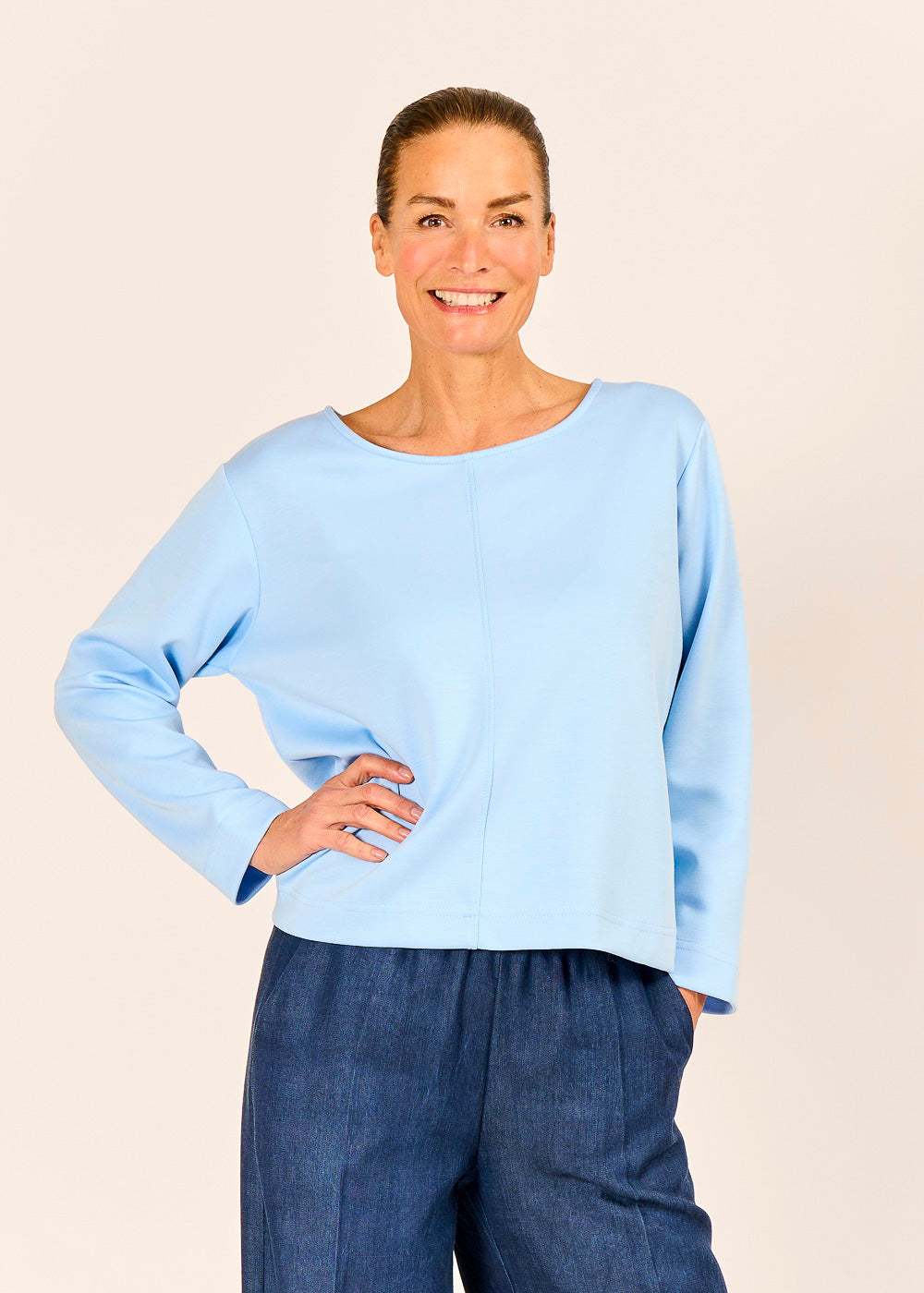 Dieses celestefarbene Shirt besticht durch seine schlichte Eleganz und den modernen, klaren Schnitt. Ein besonderes Detail ist die feine, vertikale Naht, die sich mittig über das Oberteil zieht und ihm eine dezente Struktur verleiht. Dank des hochwertigen Materials und des weiten Rundhalsausschnitts ist es ein vielseitiges, bequemes Basic – ideal für Layering oder einen cleanen, modernen Look.