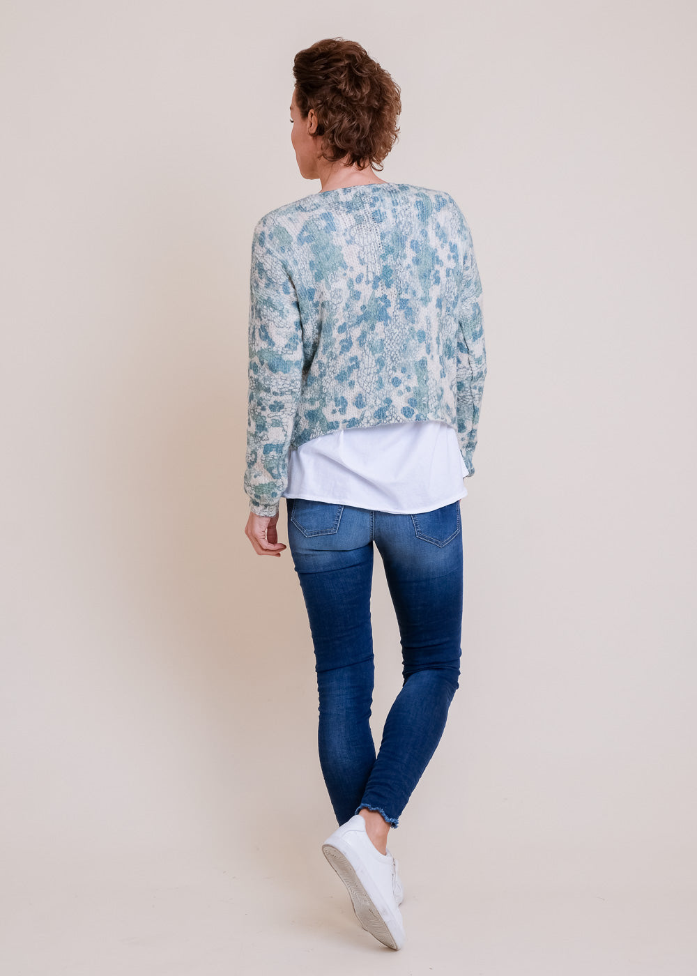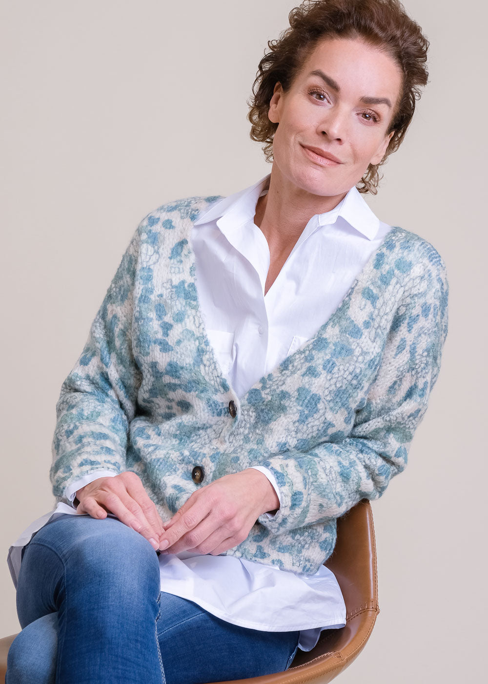 Kurz geschnittener Strickcardigan mit Wollanteil und V-Ausschnitt. Mit Knöpfen und einem modernen Druck. Ein absoluter Hingucker.