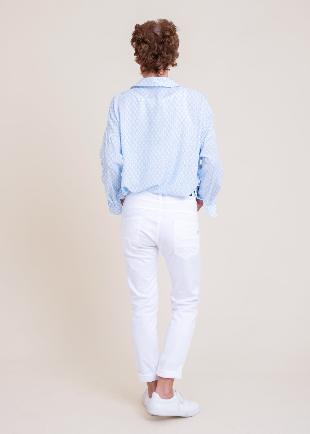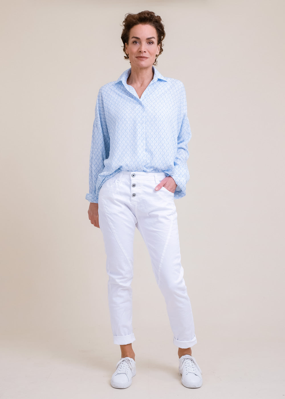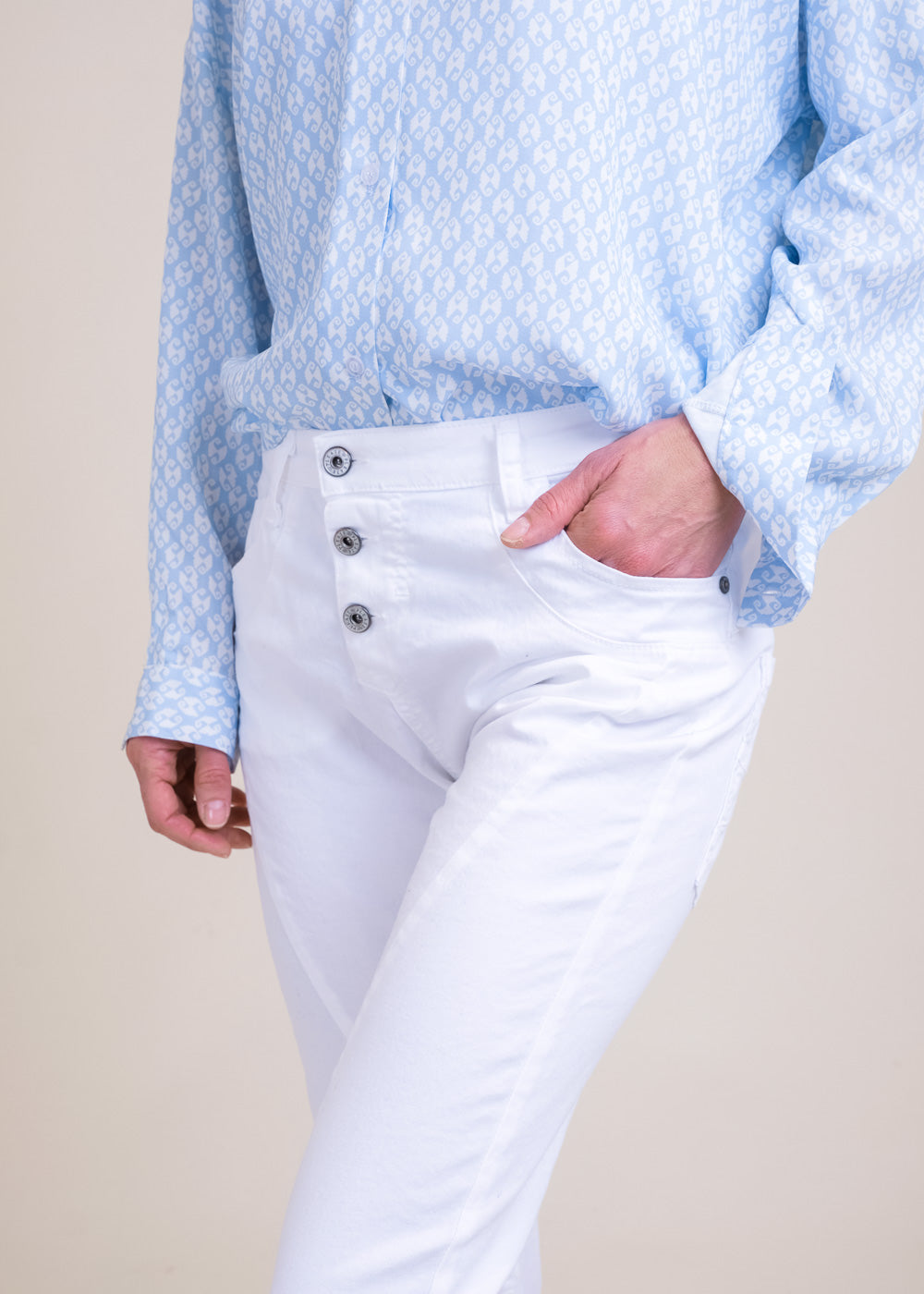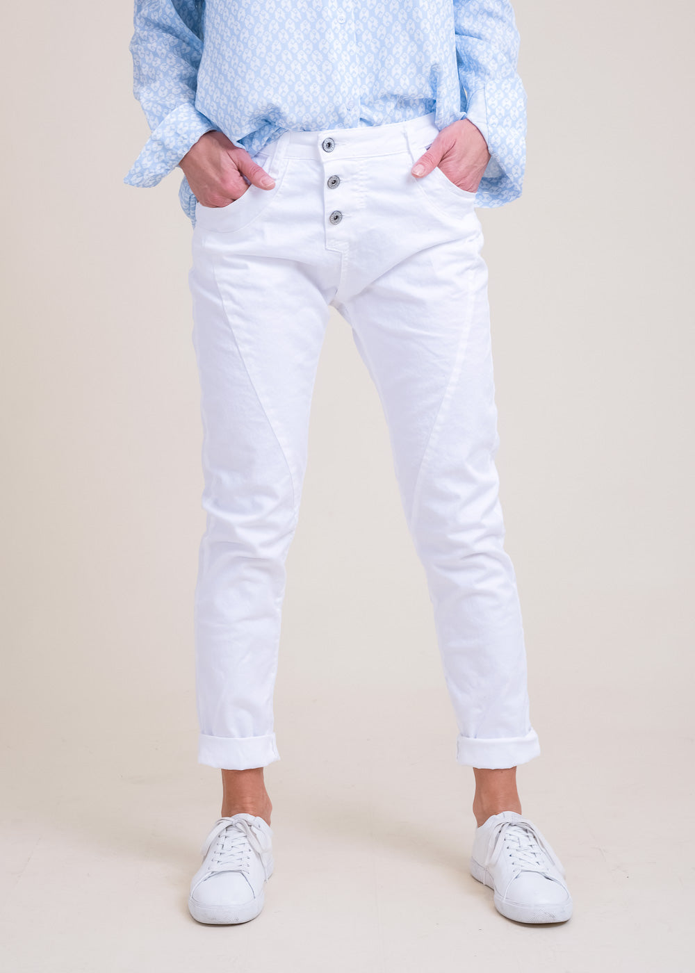 Boyfriend-Fit Hose von Please mit Stretchanteil. Sie sitzt locker auf den Hüften und hat die typische Ziernaht quer über die Vorderschenkel. Knopfleiste mit 3 Metallknöpfen vorn. Klassischer 5-Pocket Stil, mit dem kleinen Metallherz auf der Gesäßtasche.