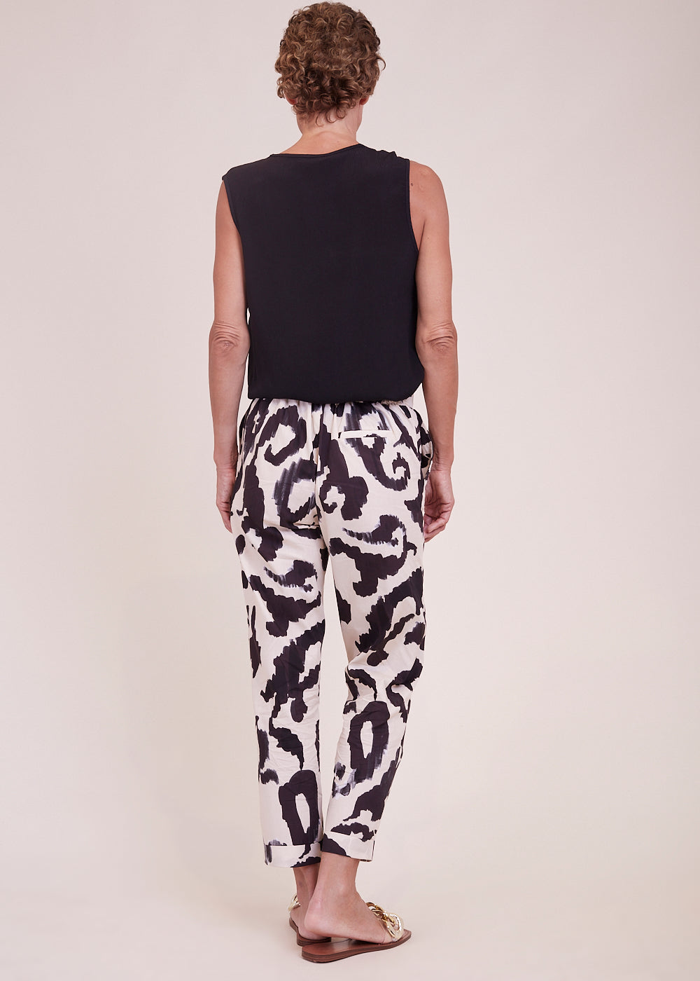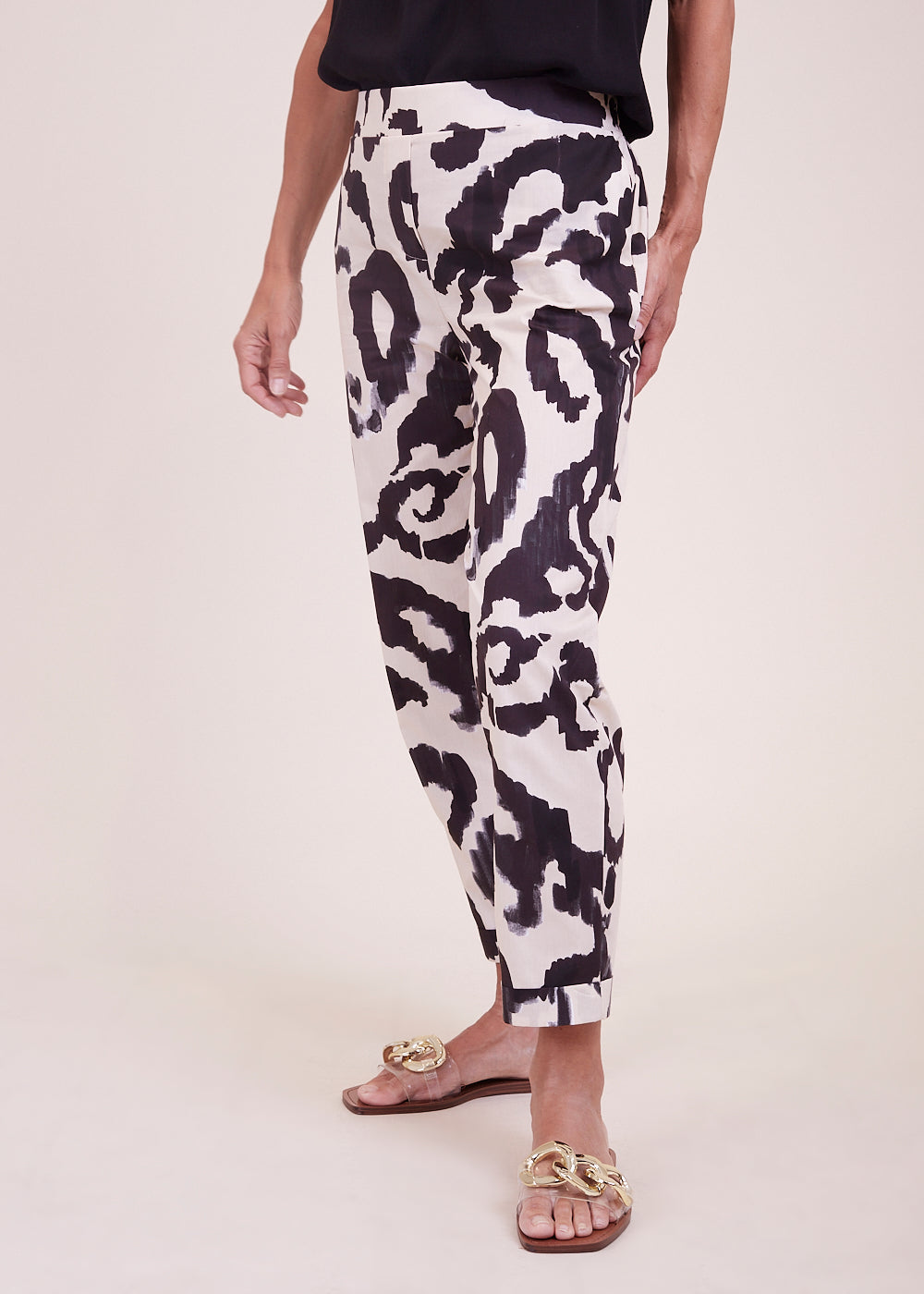 Schmale Sommerhose mit All-Over-Print. Die Hose hat eine 7/8-Länge und ist am Saumen umgekrempelt für einen raffinierten Look. Das Bündchen auf mittlerer Leibhöhe ist im Rücken mit einem Gummizug versehen für ein noch bequemeres Tragegefühl. Die Hose besitzt seitliche Eingriffstaschen.