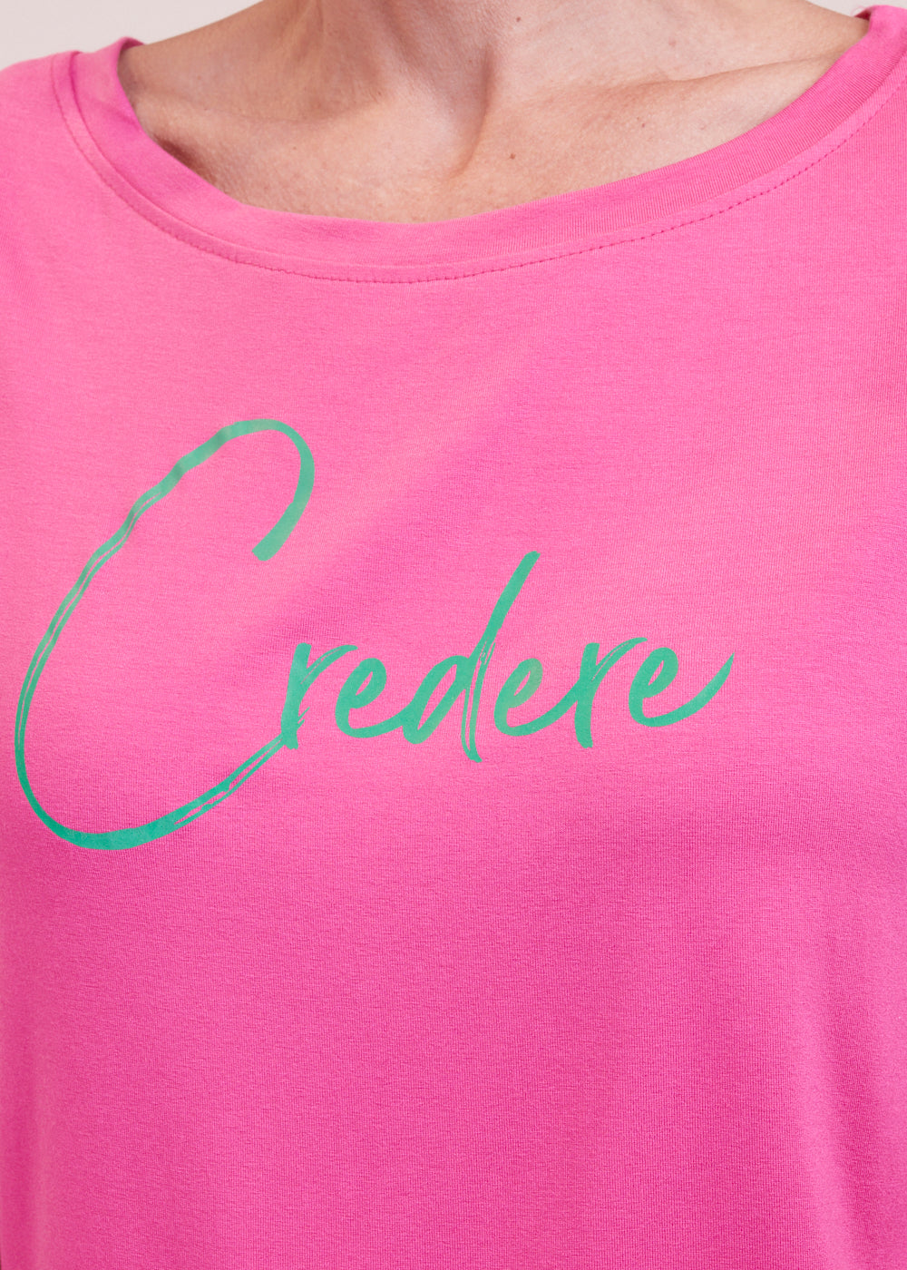 Bequemes T-Shirt mit Rundhalsausschnitt in knalligem Pink für den Sommer. Das Shirt hat einen grünen Print auf Brusthöhe. Der Stoff des Shirts ist fließend und schmiegt sich an den Oberkörper an.