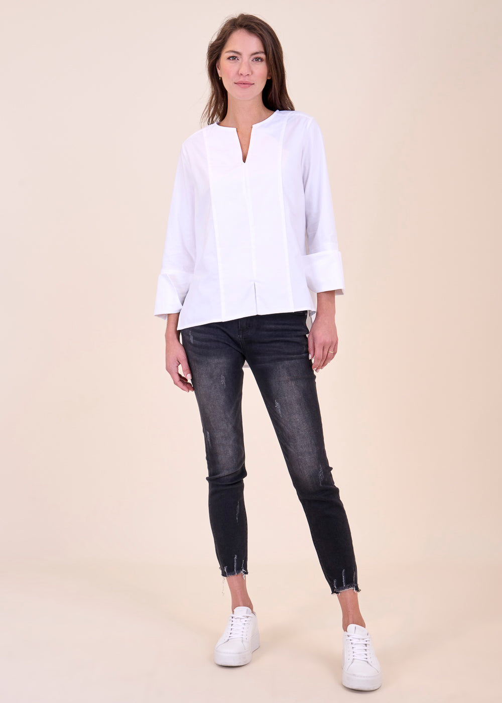 Fantastische Fashion-Bluse mit Schlitzen am Dekoltée, am Bund und an den Seiten. Die Bluse hat einen asymmetrischen Schnitt, der sich nach Hinten verlängert und lange Ärmel, die glockenförmig auslaufen. Ein umwerfendes Must-Have für echte Modeliebhaber!