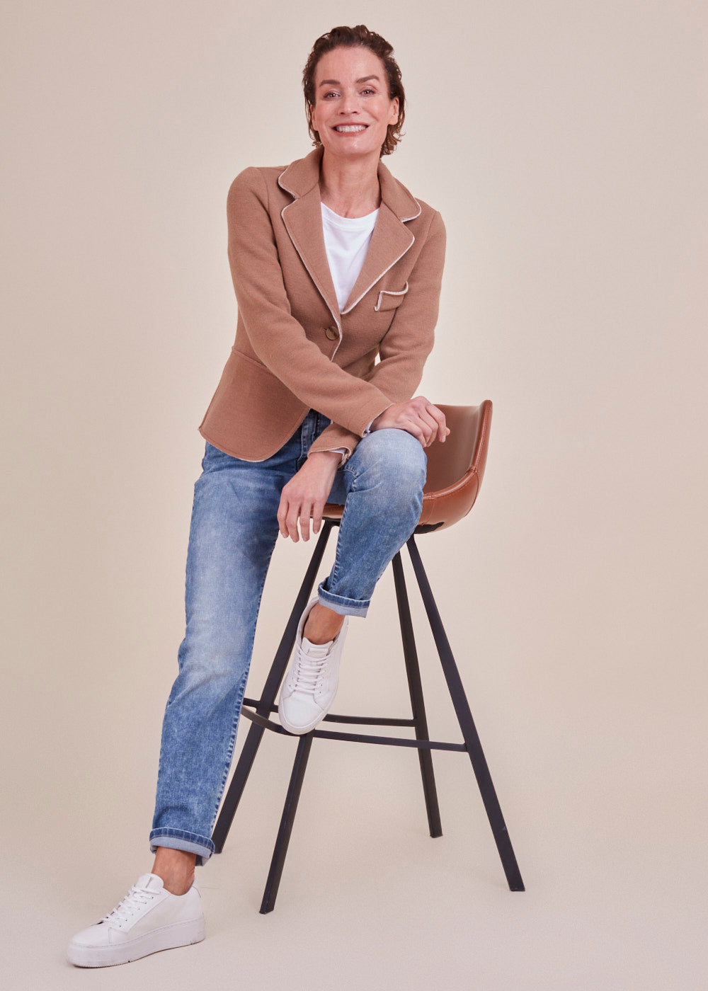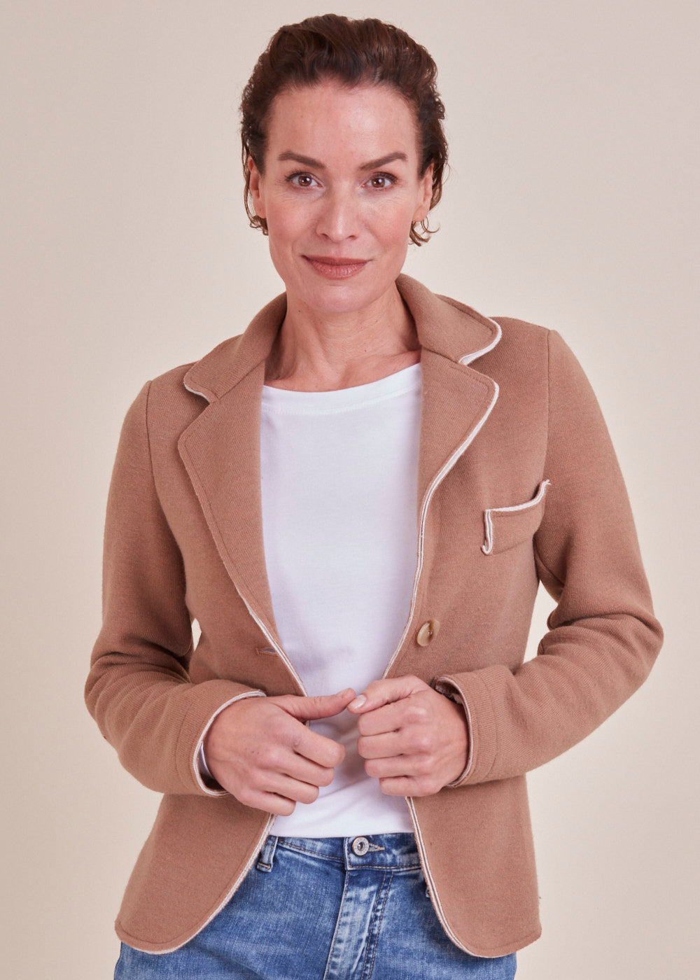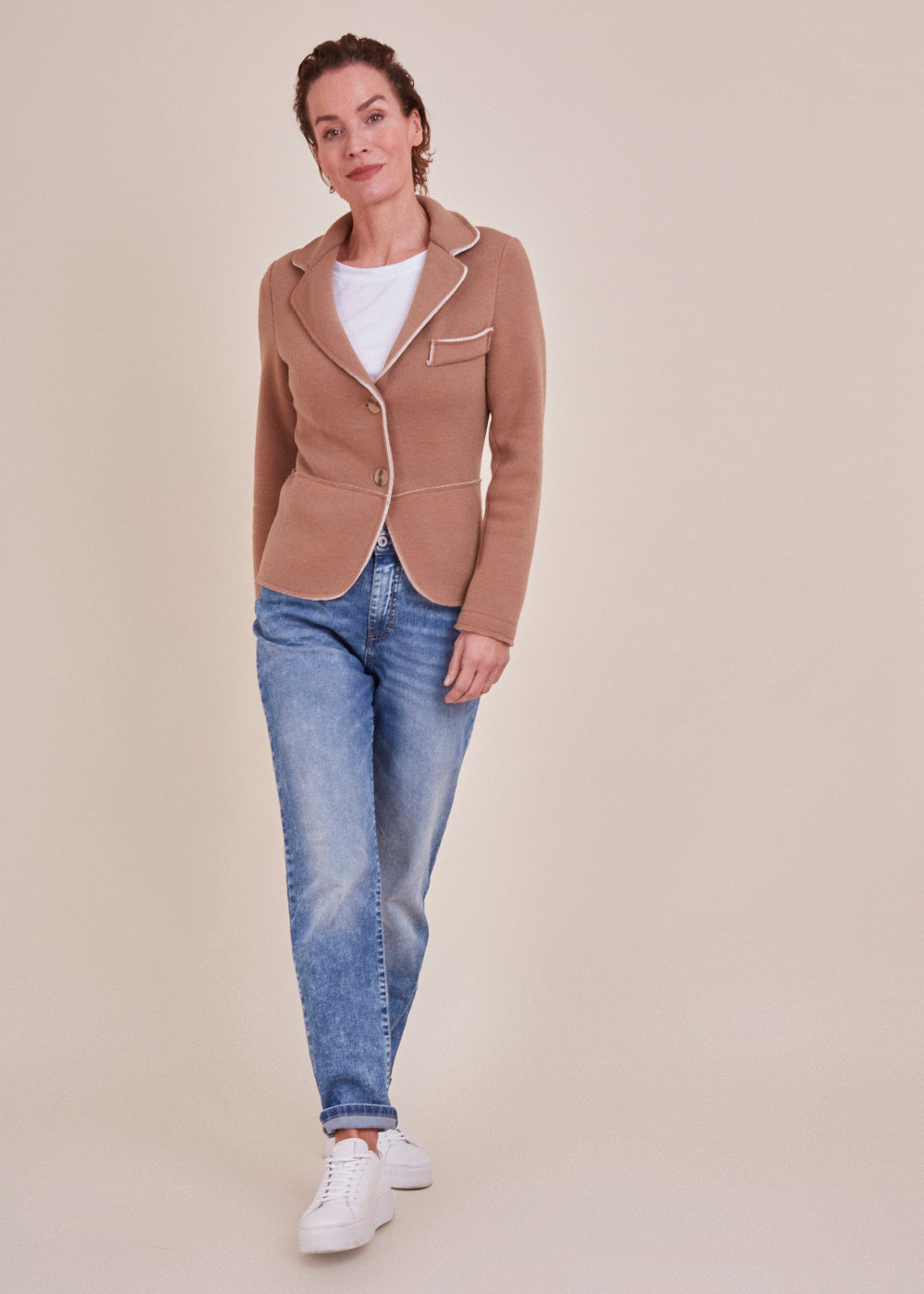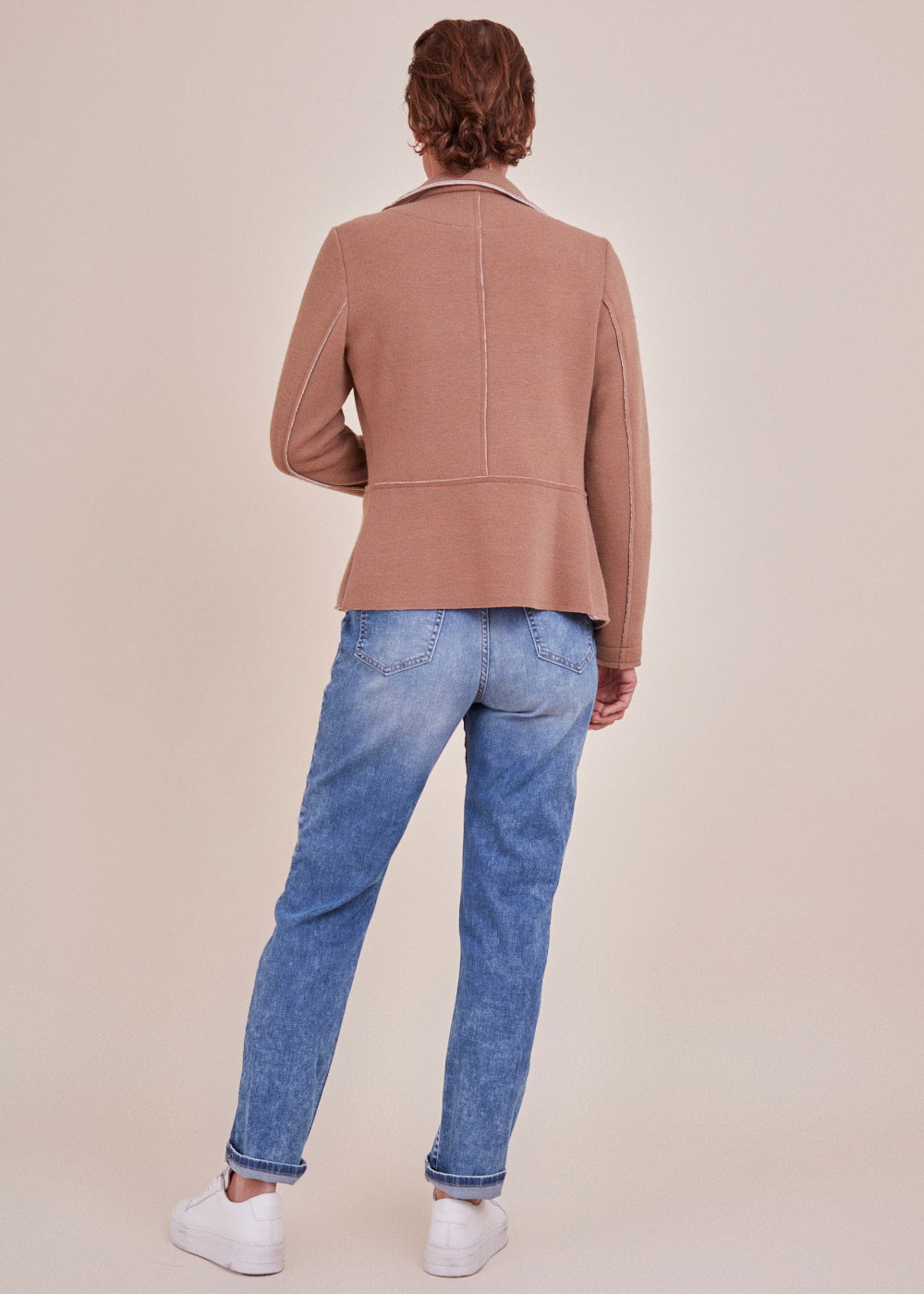 In jeder Situation gut aussehen – mit diesem Strickblazer ist das überhaupt kein Problem.  Der besondere Blazer mit seinen offenen andersfarbigen Nähten ist ein echtes Highlight. Er hat einen Reverskragen. Darüber hinaus ist er ist gerade geschnitten. Langer Ärmel mit geraden Abschlusses. Hergestellt aus einem Baumwoll-Elasthan Material.  Schöne Accessoires, gepflegte Schuhe und die passende Tasche runden Ihr Outfit ab. Dabei gilt: Umso lässiger Style und Anlass sind, umso eher kann man auch mal einen Stilbruch wagen.