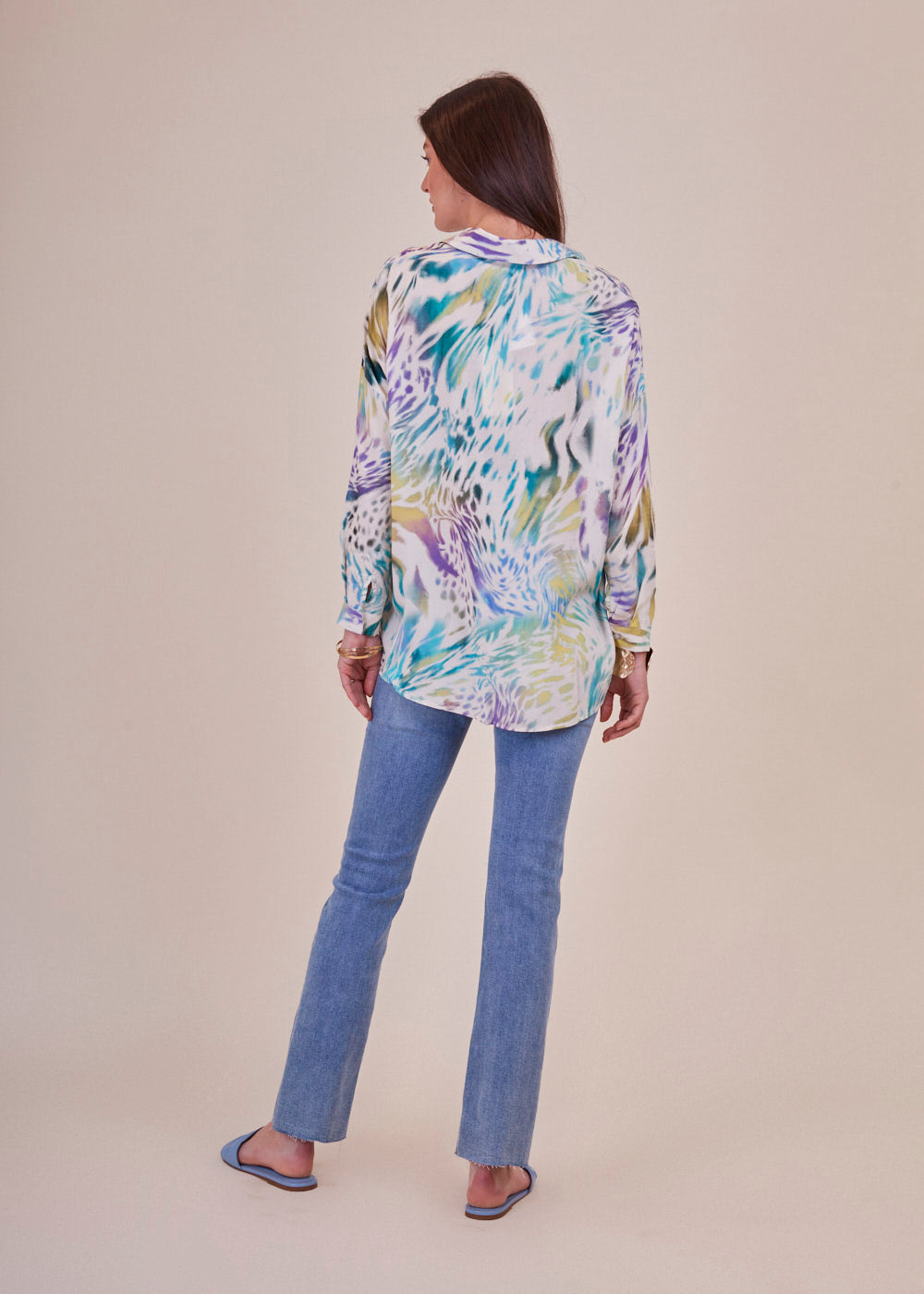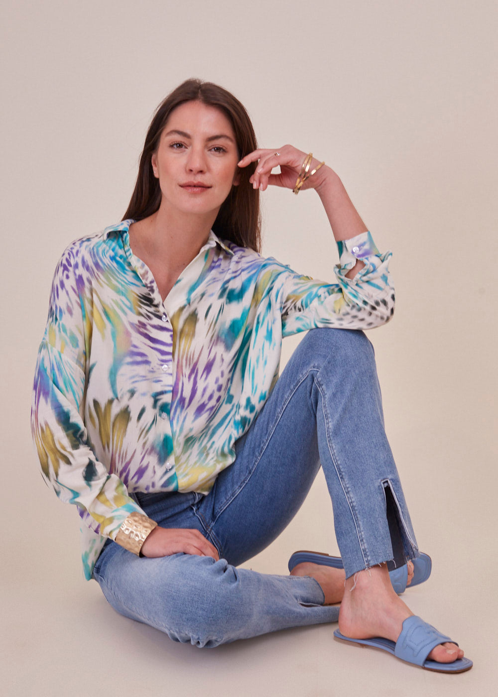 Diese gemusterte Bluse im Hemdkragen Stil ist lässig geschnitten. Die frischen Farben verleihen deinem Look die perfekte Frische. Einfach besonders!
