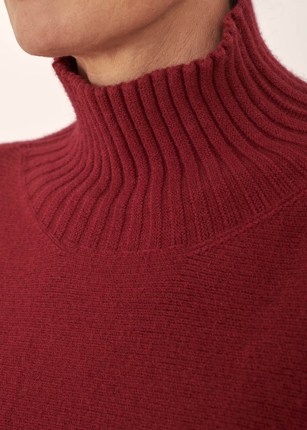 Kurz geschnittener Strickpullover mit Stehkragen aus unserem Kuschelgarn. Er hat ein Rippenbündchen am Kragen und an den Ärmeln. Mit kurz geschnittenen Armen. Einer unserer Lieblinge.