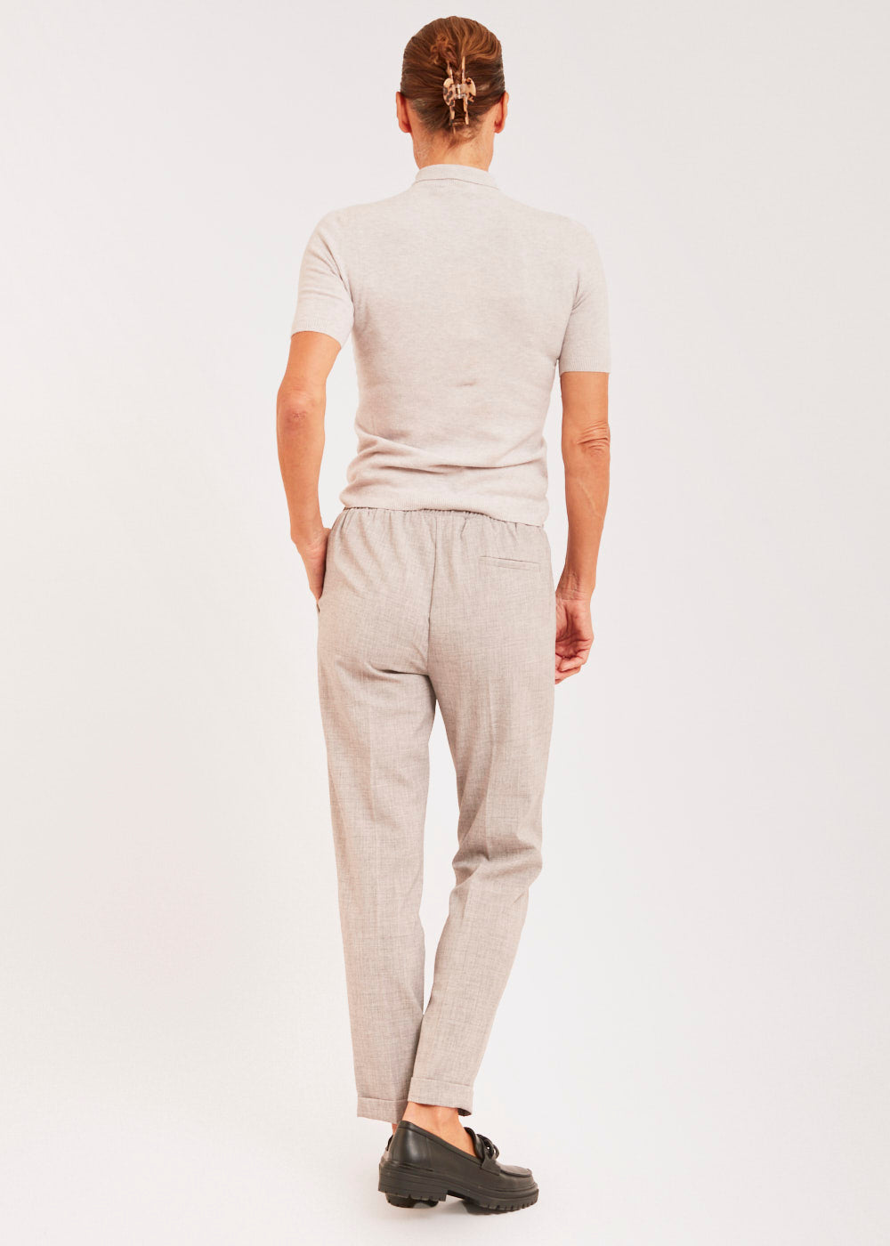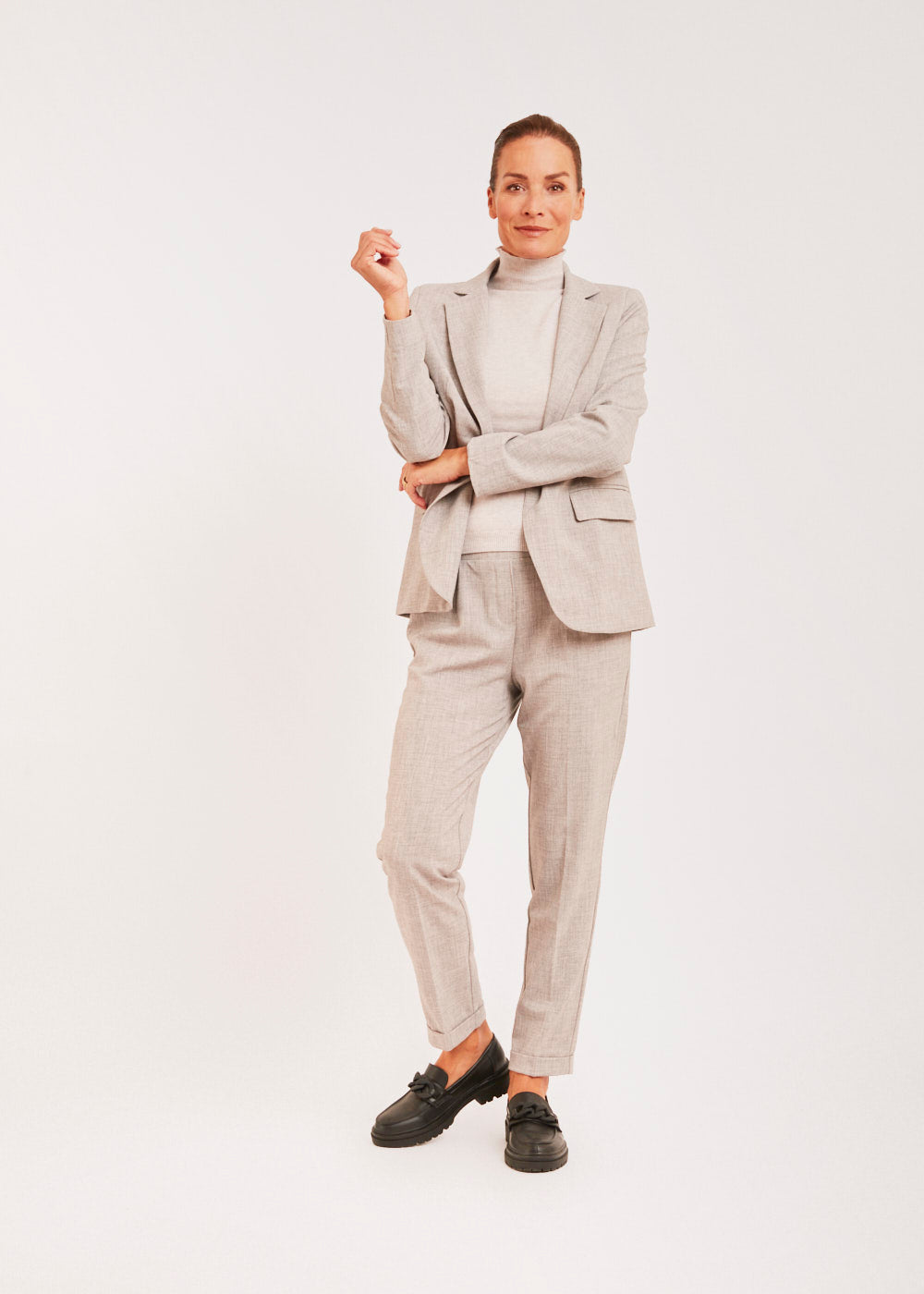 Tolle Bundfaltenhose mit geradem Bein. Die Hose sitzt besonders lässig durch seinen Gummizug und hat seitliche Eingriffstaschen. Besonders toll in Kombination mit dem passenden Blazer und einer weißen Bluse. Einfach lässig und stylisch.