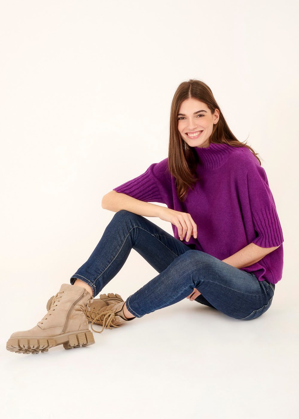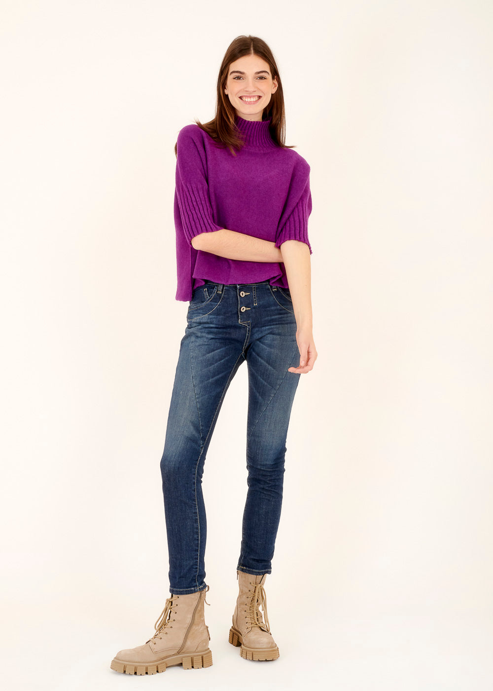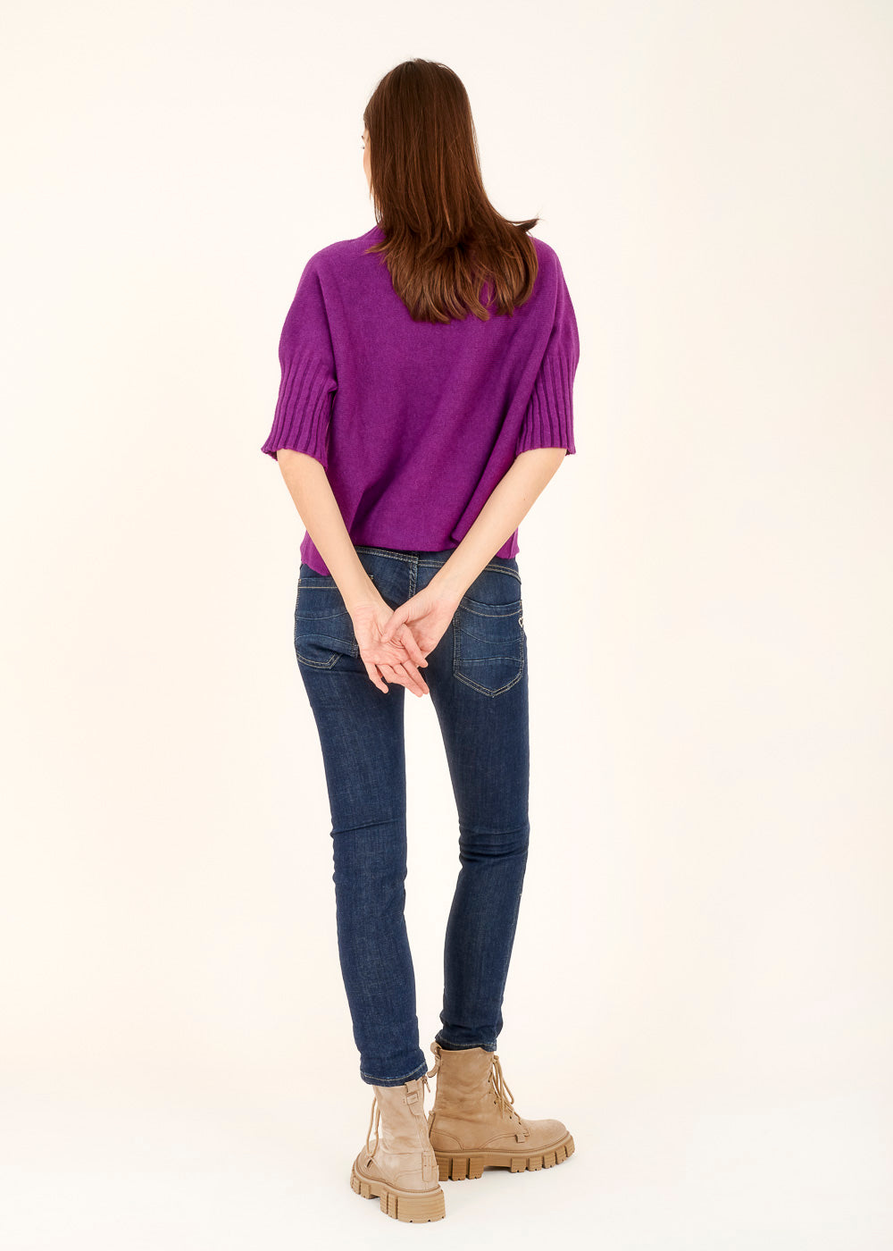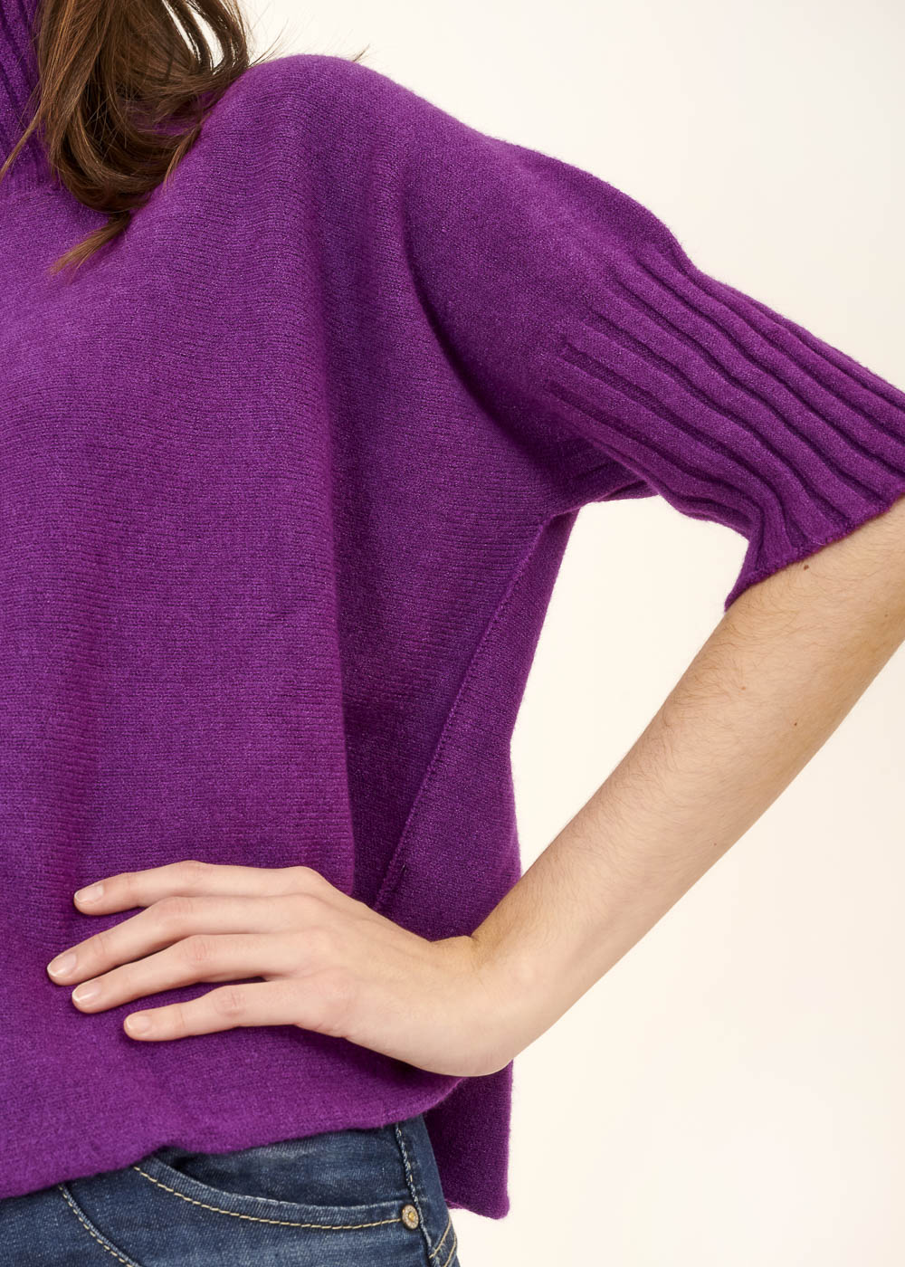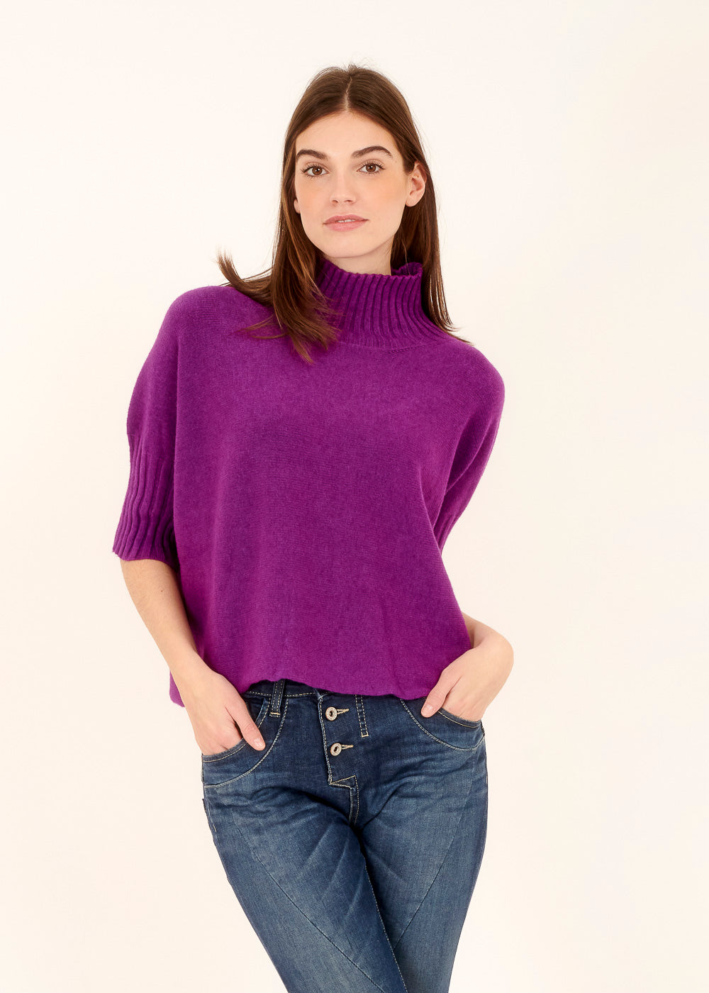 Unser Strickliebling! Kastig geschnittener Strickpullover mit Rollkragen aus unserem Viskose-Kuschelgarn. Mit Rippenbündchen am Kragen und am Ärmelnabschluss. Mit 3/4-Arm.