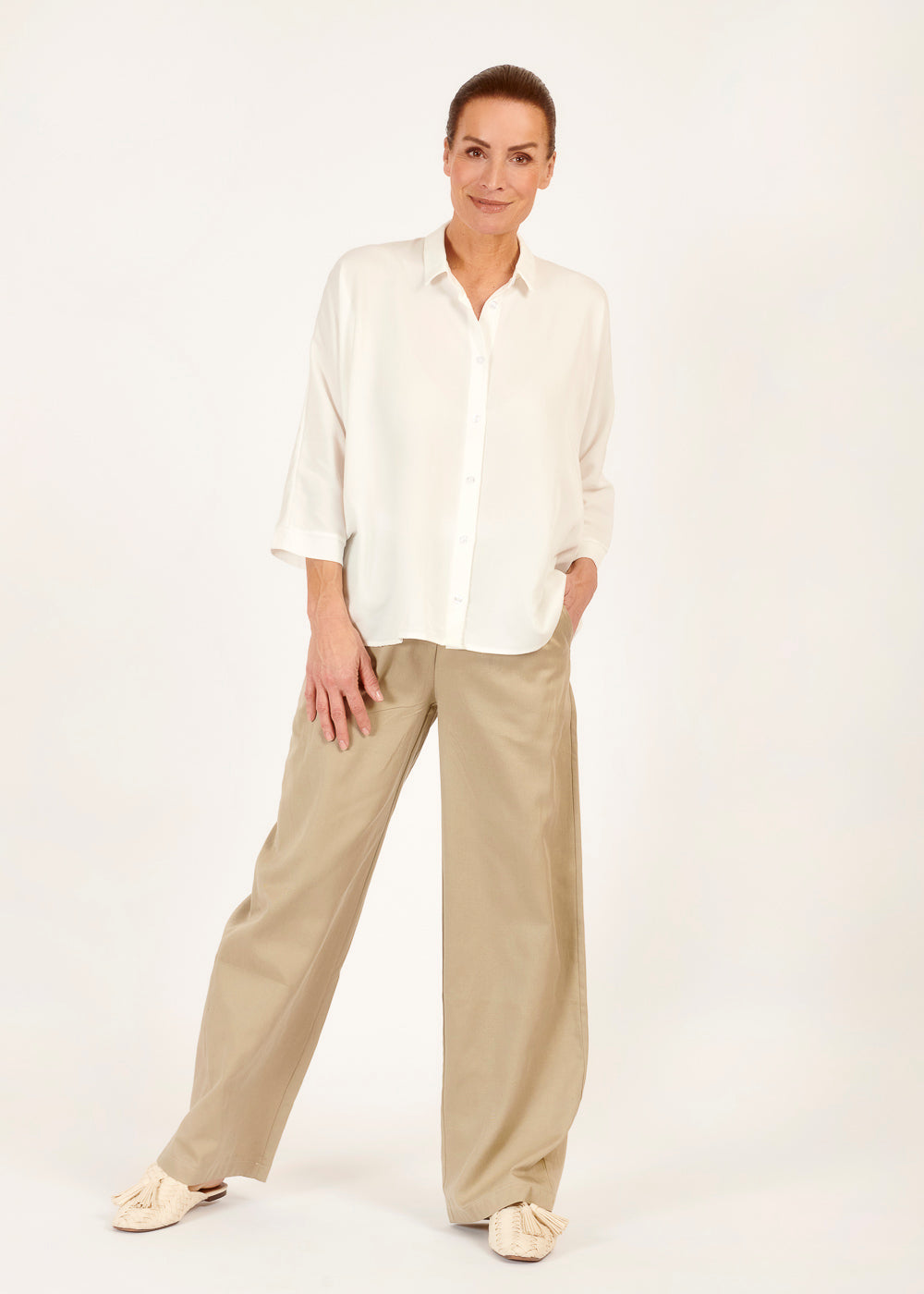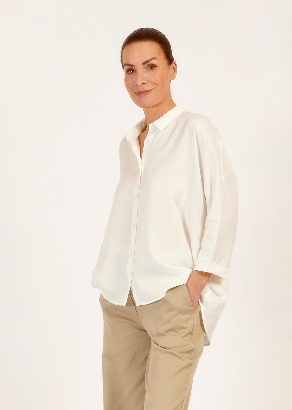 Stilvoll und bequem zugleich – unsere Hemdkragenbluse aus fließender Viskose mit dreiviertel Ärmeln ist das Must-Have für jede moderne Garderobe. Erlebe die perfekte Kombination aus Eleganz und Tragekomfort und setze mit diesem zeitlosen Stück ein Fashion-Statement.
