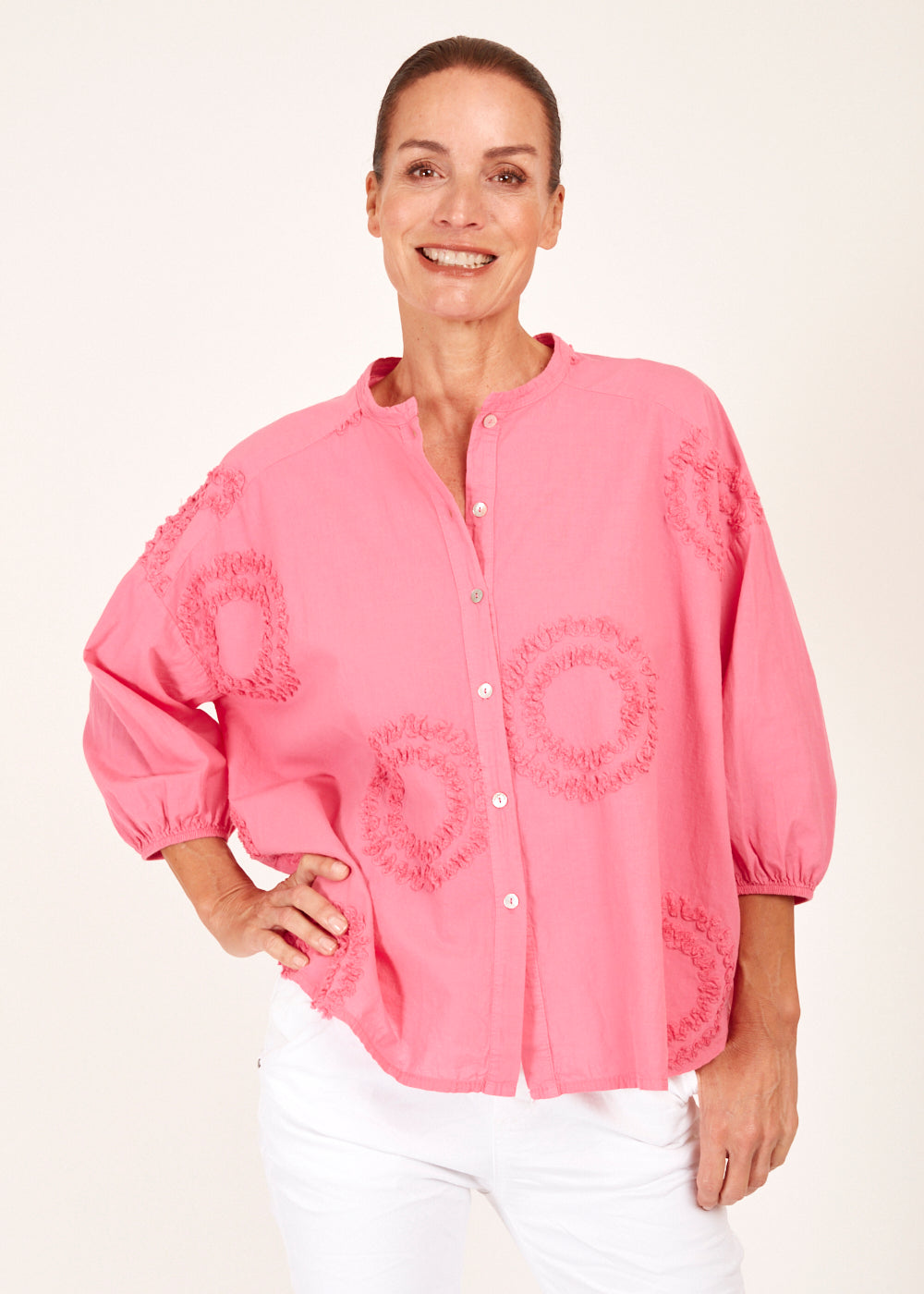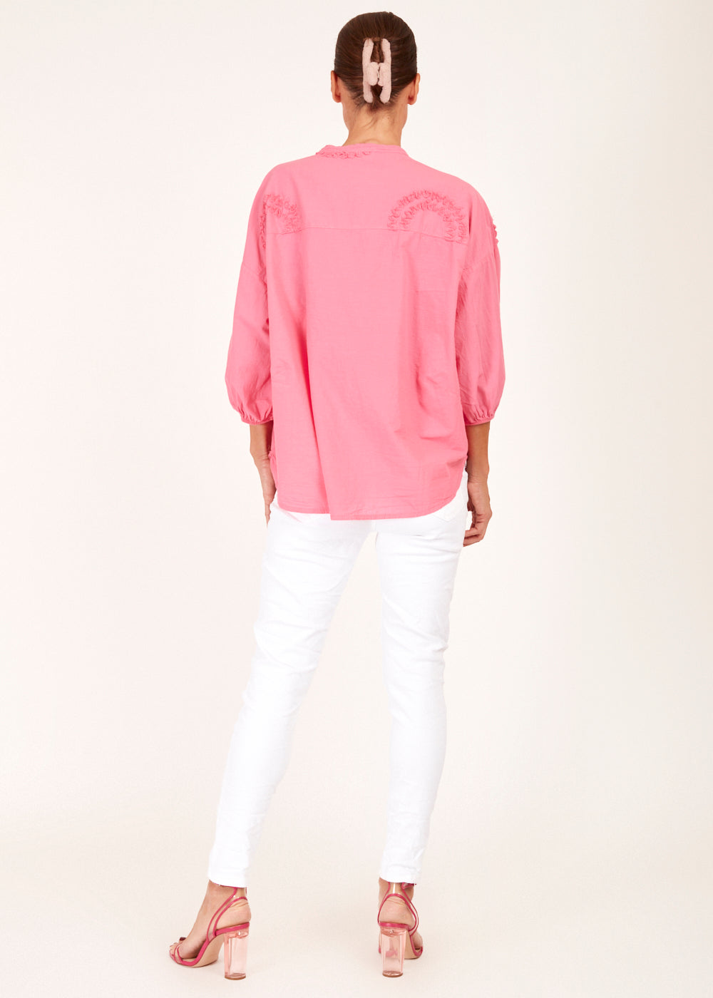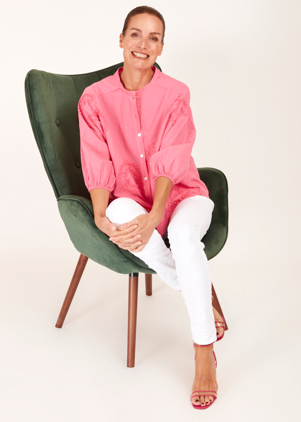 Bringe mit unserer fuchsia-bestickten Bluse Farbe in deine Garderobe und setze ein stylisches Statement! Perfekt kombiniert zu einer weißen Hose