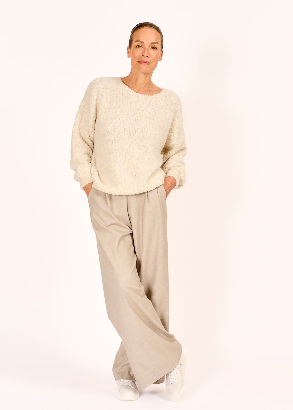Kuschelig, stilvoll und vielseitig – dieser Bouclepullover in Beige ist dein perfekter Begleiter für gemütliche Tage und elegante Outfits. Weich und zeitlos im Design, ergänzt er deinen Look mit einer warmen, modernen Note.