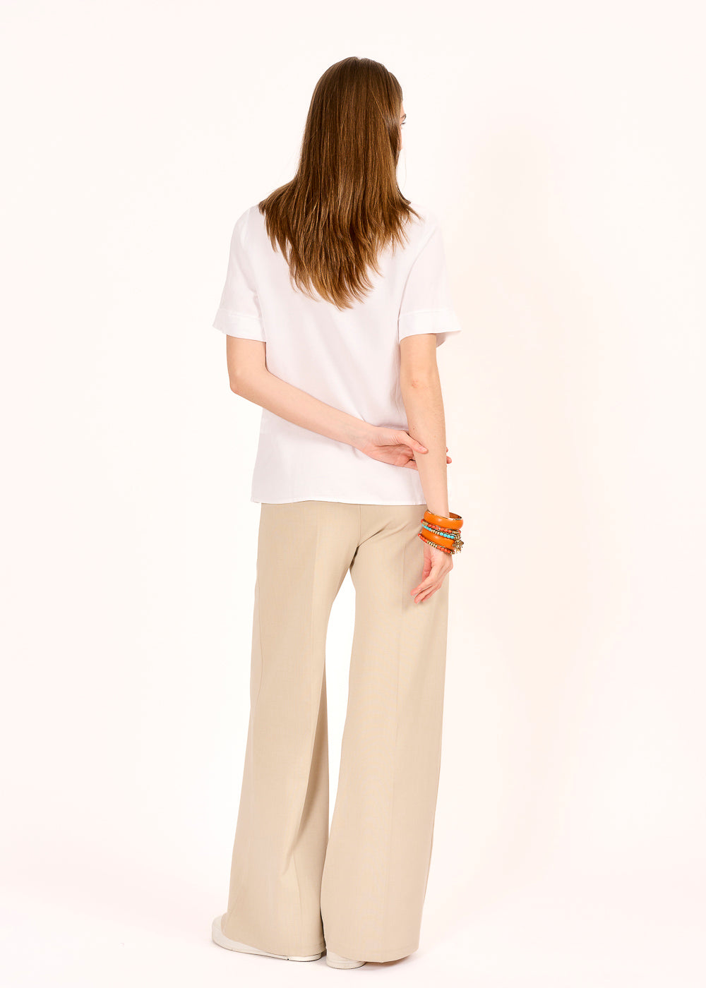 Diese weiße Bluse mit kleinem Kragen besticht durch ihre schlichte Eleganz und ihren modernen Schnitt. Der tiefer geschnittene Kragen sorgt für einen dezenten, schönen Ausschnitt, der das Design besonders feminin macht. Mit ihren halblangen Ärmeln ist sie ein vielseitiges Essential für stilvolle Looks.