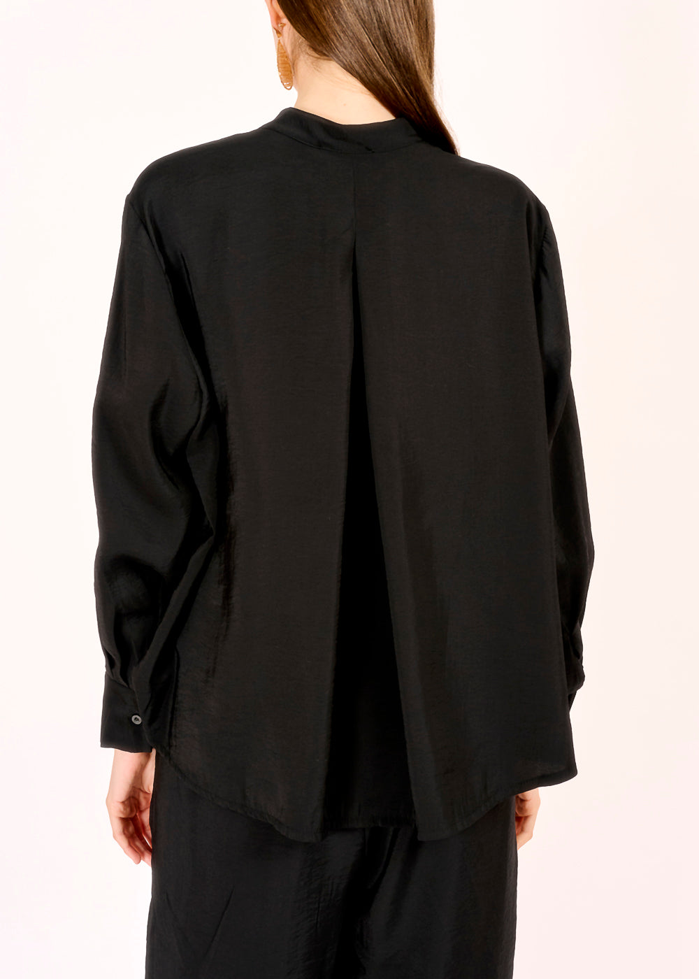 Dieses Blusenhemd in klassischem Schwarz überzeugt durch seine elegante Schlichtheit mit einem raffinierten Detail. Die besondere Rückenfalte verläuft bis in den Halsausschnitt und verleiht der Bluse eine stilvolle, fließende Silhouette mit schönem Volumen. Ein vielseitiges It-Piece für moderne Looks – ob im Büro oder in der Freizeit.