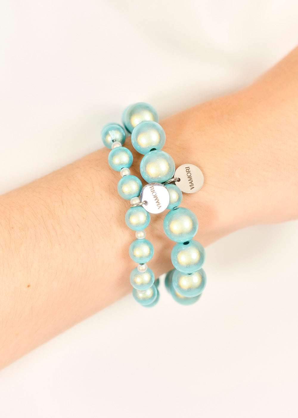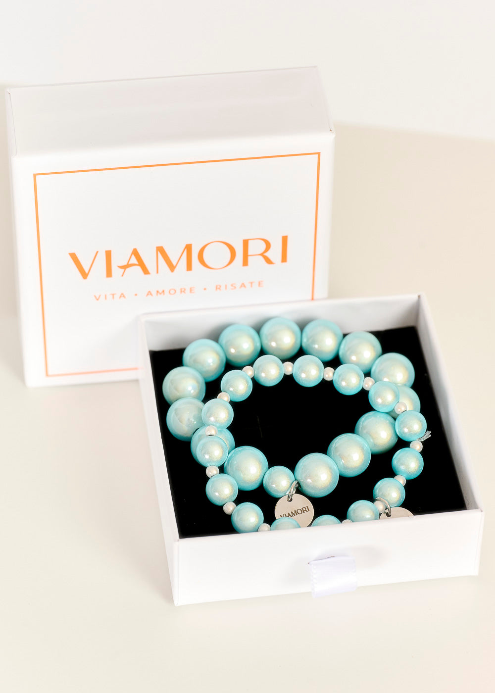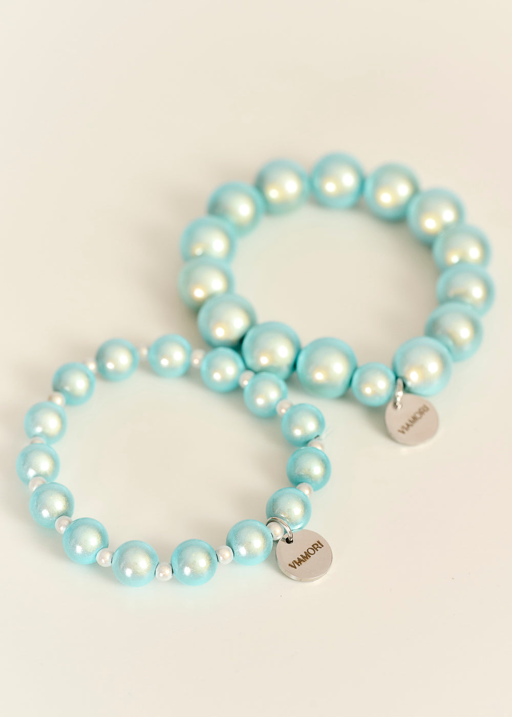 Dieses bezaubernde Armband-Set fasziniert mit schimmernden Perlen in einem himmlischen Türkisblau, die bei jeder Bewegung sanft glänzen. Die harmonische Kombination aus unterschiedlich großen Perlen und feinen Silberakzenten schafft ein elegantes und lebendiges Design. Tragen Sie die Armbänder einzeln für einen subtilen Akzent oder zusammen, um Ihrem Look eine frische und strahlende Note zu verleihen.