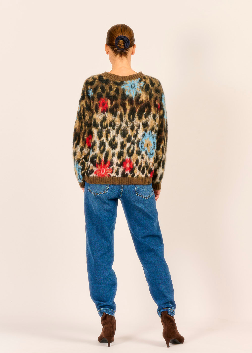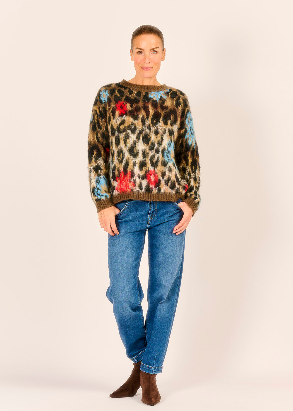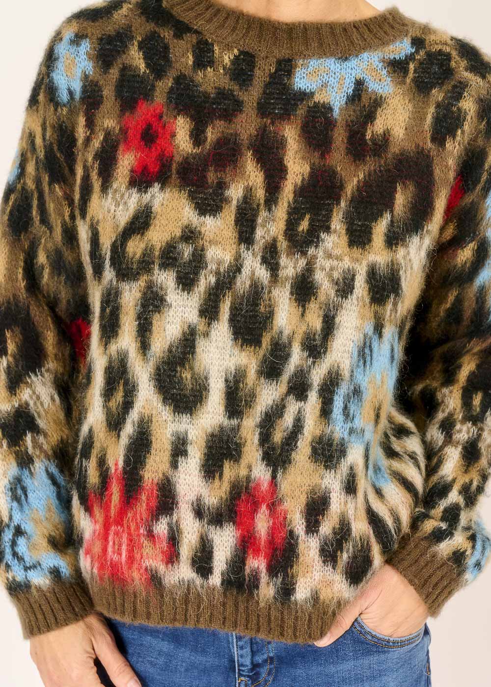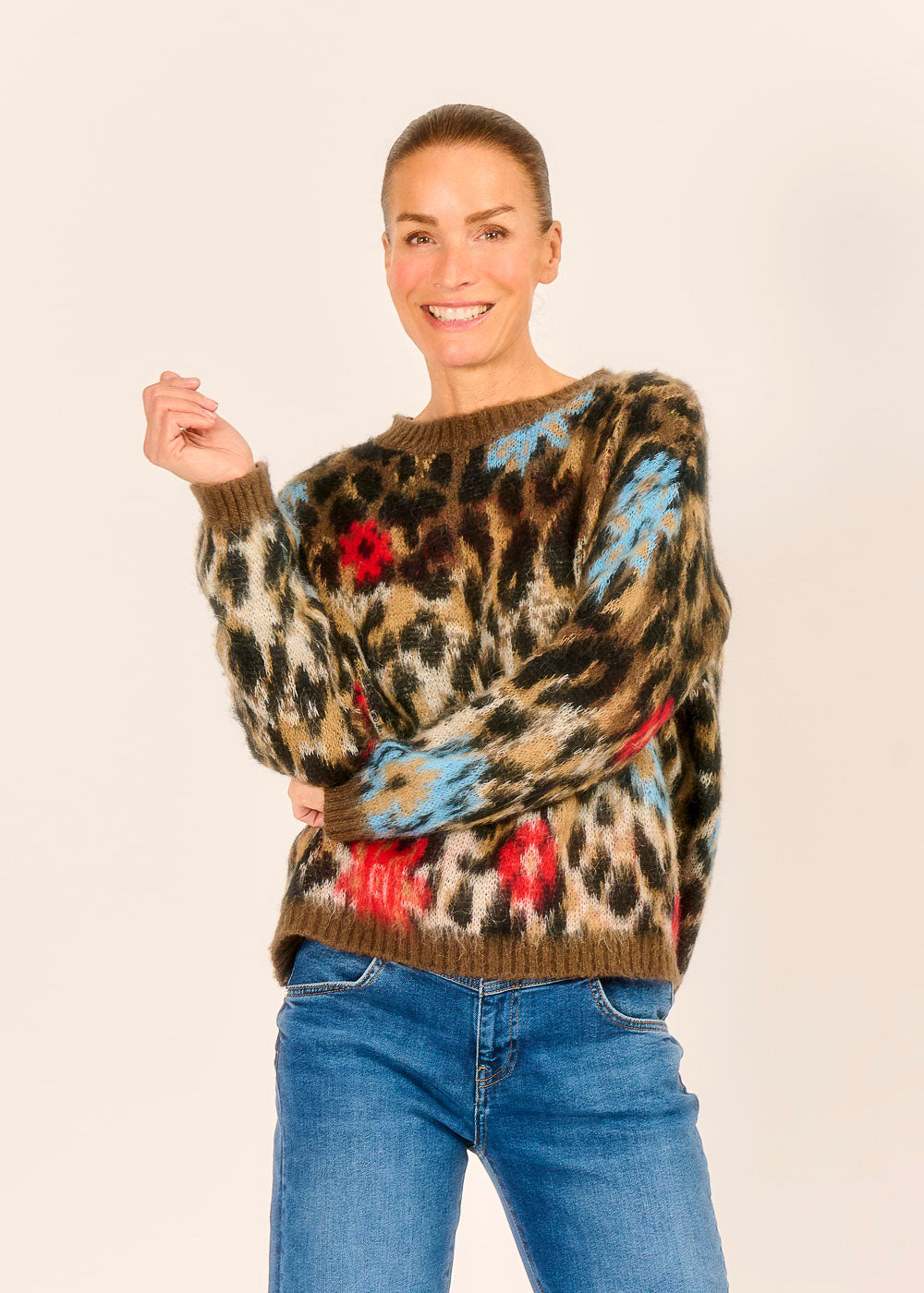 Dieser Animal-Pullover ist ein absolutes Statement, das den klassischen Leoparden-Print durch eingestreute, knallige Farbakzente in Rot und Blau sehr speziell und sehr trendy interpretiert. Das flauschige Material sorgt für ein kuscheliges Tragegefühl, während der aufregende Mustermix Ihre wilde Seite auf modische Weise in Szene setzt. Mit diesem Pullover holen Sie sich ein unkonventionelles Key-Piece in die Garderobe, das garantiert alle Blicke auf sich zieht.